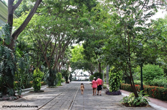 Durante los siguientes tres días recorrimos los puntos más atractivos de Guayaquil, siempre bajo un sol agobiante. Primero, el centro. Caminamos por el elegante Parque del Centenario y por la calle principal 9 de Octubre plagada de locales, para luego dirigirnos a la enorme Catedral y el peculiar Parque Bolívar, donde se pueden observar de cerca un gran número de iguanas curiosamente sociables. En la zona también es posible apreciar las iglesias de La Merced y San Francisco. Luego recorrimos el Malecón 2000, que bordea el río en un paseo muy relajante con museos, jardines, monumentos (como el Hemiciclo de la Rotonda y la Torre Morisca o del Reloj), aéreas de juegos, un centro comercial, patios de comida y varios miradores a los cuales se puede subir para observar desde lo alto las edificaciones, los barcos (que pueden abordarse) y el paisaje. Aquí almorzamos y probé mi primer ceviche, en este caso de camarón, fresco y demasiado sabroso, además de degustar las típicas empanadas de maduro, toda una novedad. Por su parte, el moderno Malecón del Salado se ubica al oeste, con su puente peatonal colgante en forma de arco.